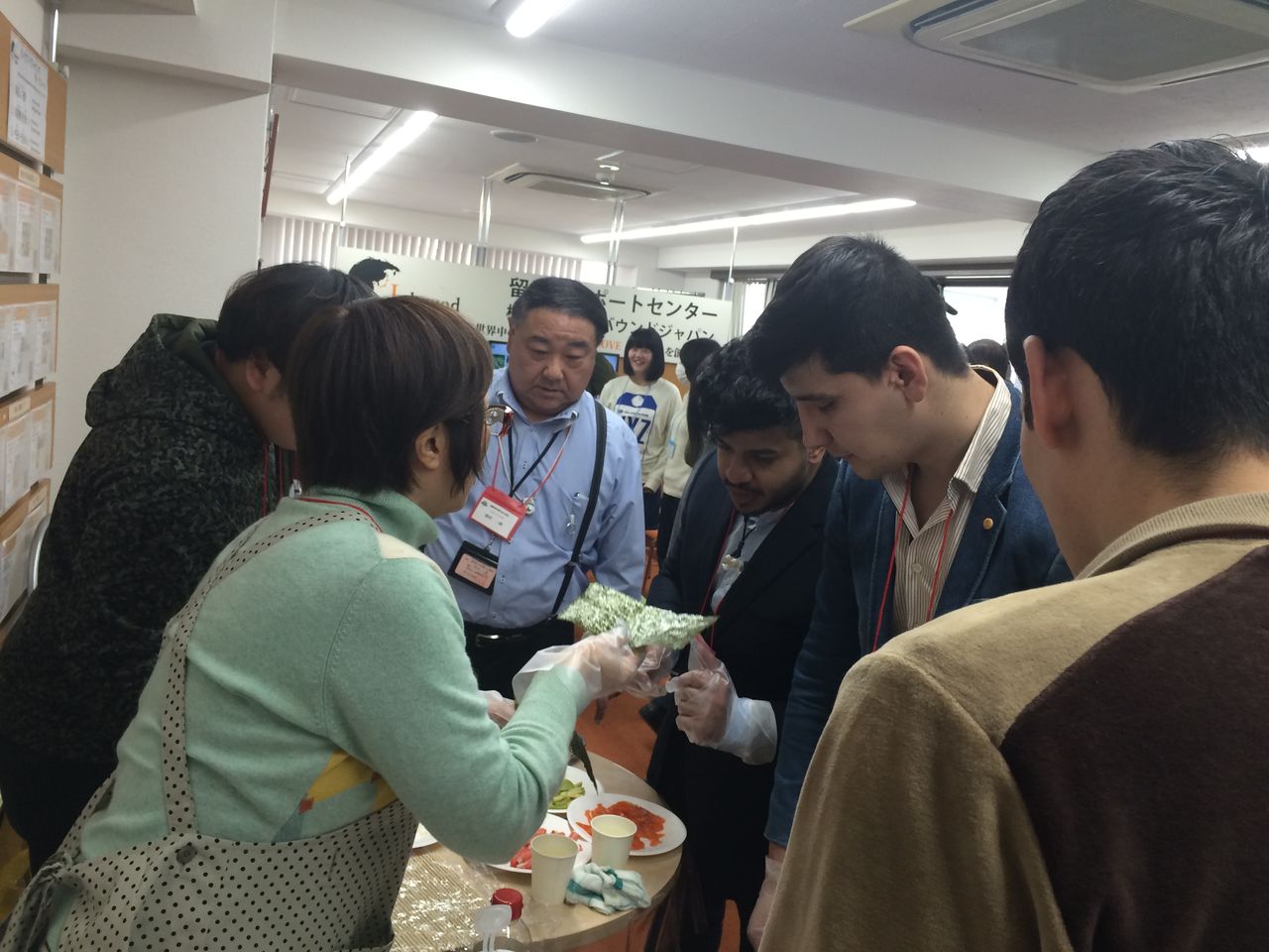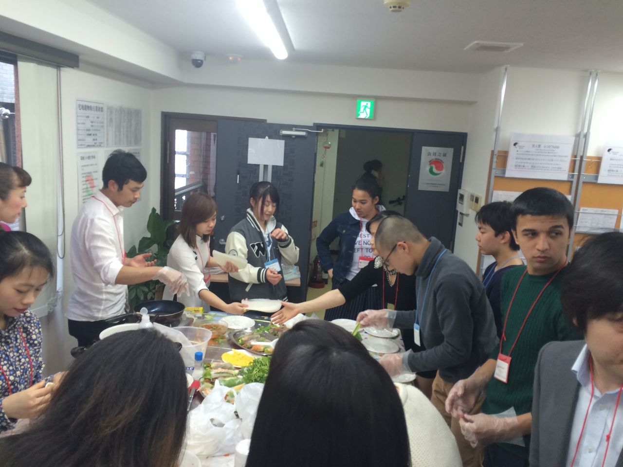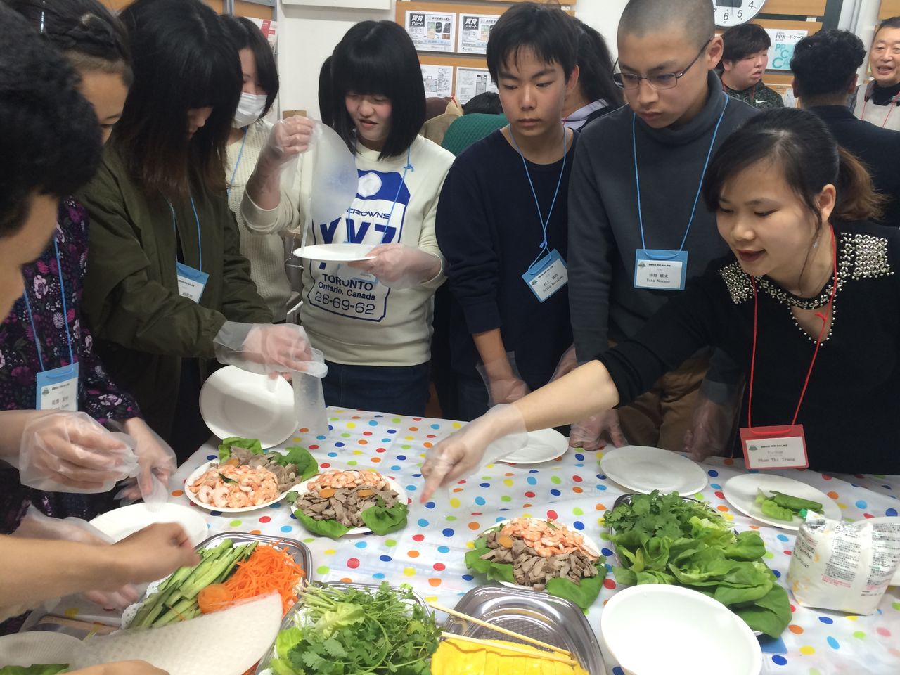 日本の料理として巻きずしを外国人留学生の皆様と作ったり、また、外国の料理として、日本人学生が水餃子の皮を作ったり、生春巻きをまいたりと体験をすることができました。