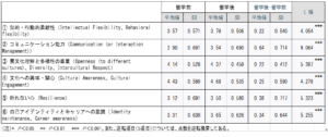 「留学による考え方や行動(マインドセット/コンピテンシー)の変化」は29の設問項目から構成されていたが、これでは設問項目が細分化され過ぎているおり、留学に伴う変化を全体的に俯瞰したい本小論にはふさわしくない。そこで、これら29の項目を以下の通り、6種類のマインドセット/コンピテンシーとしてグルーピング化した。