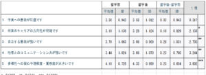 表2の左欄で留学前の各項目の平均値を見てほしい。自己評価の中で、「5.多様性への関心や許容度」の平均値が4.10と最も高く、逆に、「2.キャリアの方向性」が3.10と最も低くなっている。今回の短期留学に参加した学生においては、多様性への関心や許容度については自信があるが、キャリアの方向性はまだ見つかっていないということを示しているとみられる。