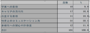 まず、留学前において、「今回の留学を通じて最も高めたいもの」を尋ねた。ただし、選択肢は5項目である。その結果は、表1の通りである。